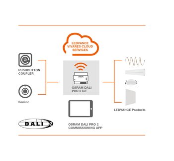L’unité de contrôle OSRAM DALI PRO 2 IoT est au cœur de LEDVANCE VIVARES DALI. Le système connecte les composants DALI-2, tels que les capteurs, les coupleurs à boutons poussoirs ainsi que les luminaires LEDVANCE VIVARES DALI-2.