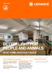 Dans les hangars et l’installation de production de fromage, les sources de lumière traditionnelles ont été remplacées par des luminaires DAMP PROOF SPECIAL 1500 50 W IP66 et IP69K qui fournissent une lumière uniforme et confortable pour les chèvres. Ces luminaires totalement hermétiques et résistants à l’ammoniac sont également étanches et conviennent donc à l’environnement agroalimentaire, comme la production de fromage.